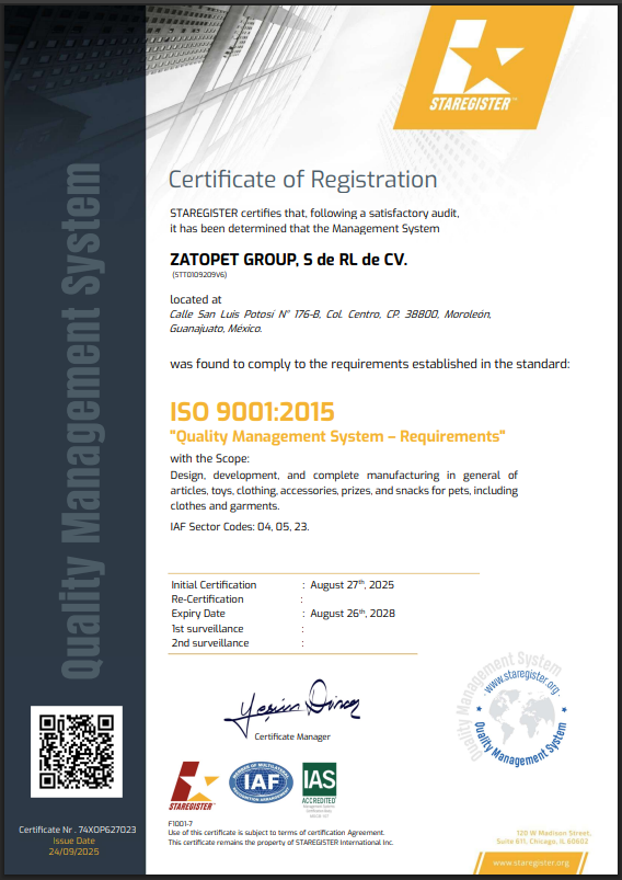 En Zatopet trabajamos con los más altos estándares de calidad. Nuestra ropa para perritos cuenta con certificación ISO-9001, garantizando procesos confiables, materiales seguros y productos diseñados para durar.”